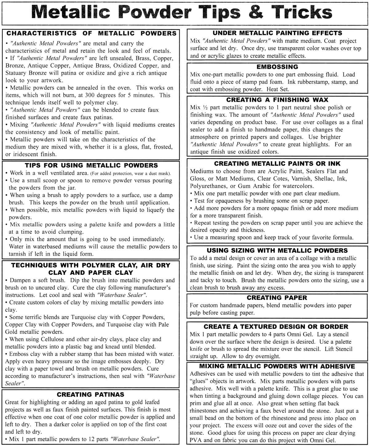 メタリックパウダーを1/2の割合で、中性靴墨または仕上げワックスを1の割合で混ぜます。「メタルパウダー」の使用量は、製品のベースによって異なります。コラージュの上に仕上げ材として使い、手漉き紙やコラージュの仕上げに使用します。印刷物やコラージュの雰囲気を変えることができます。鮮やかな色の「メタルパウダー」を使うと、美しいハイライトが生まれます。アンティーク調に仕上げるには、酸化染料を使用します。
