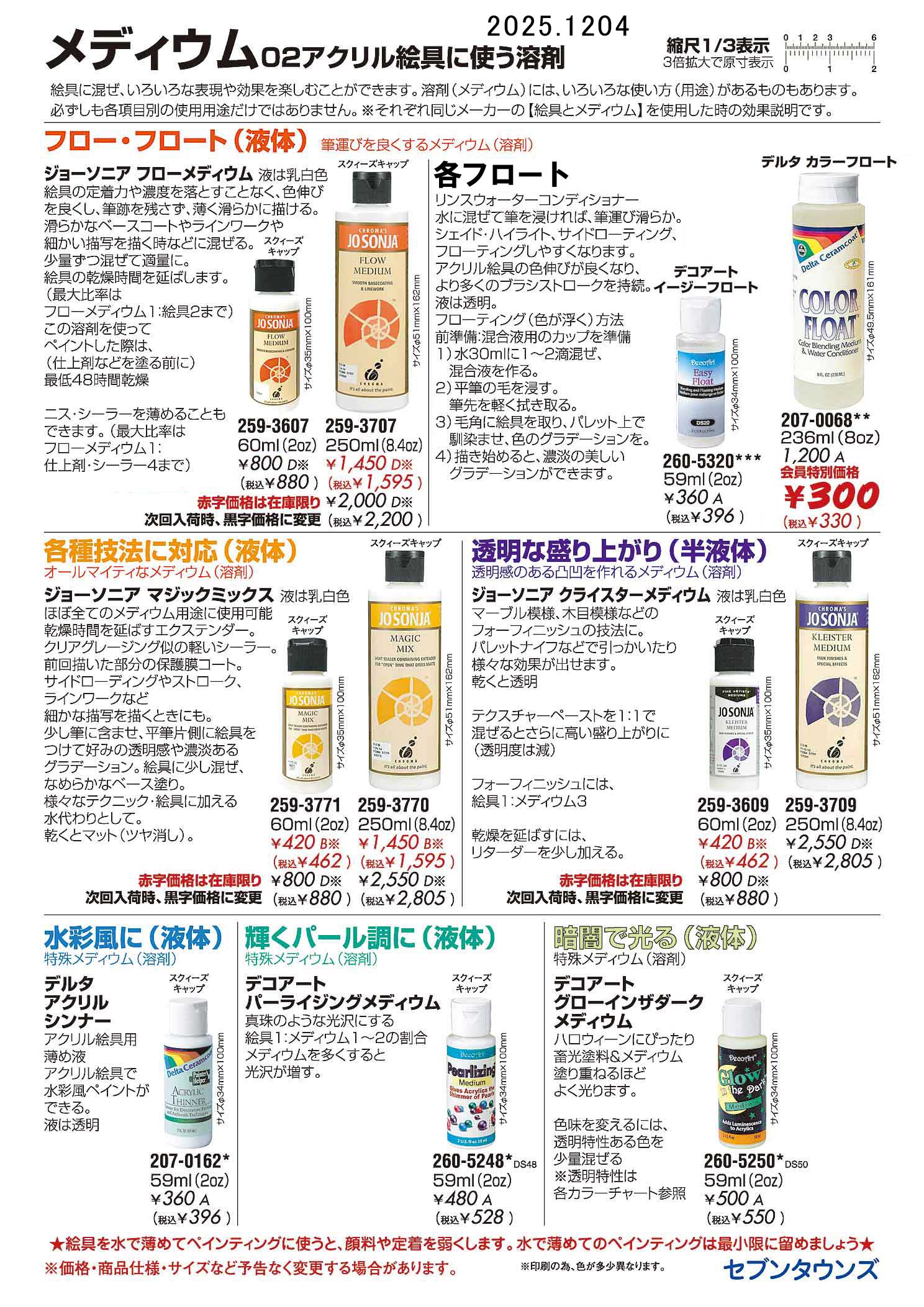 以下掲載商品、現時点での価格変更 ※さらに、価格を変更する場合がございます。随時ページを更新していただき、ご確認ください。 ★メディウム02・アクリル絵具に使う溶剤、 ●フロー・フロート液体 ジョーソニア フローメディウム、60ml、259-3607、250ml、259-3707、 デコアート イージーフロート、260-5320、 デルタ カラーフロート、207-0068、 ●各種技法に対応 ジョーソニア マジックミックス、60ml、259-3771、250ml、259-3770、 ●透明な盛り上がり ジョーソニア クライスターメディウム、60ml、259-3609、250ml、259-3709、 ●水彩風に デルタ アクリルシンナー、207-0162、 ●輝くパール調に デコアート パーライジングメディウム、260-5248、 ●暗闇で光る デコアート グローインザダークメディウム、260-5250、