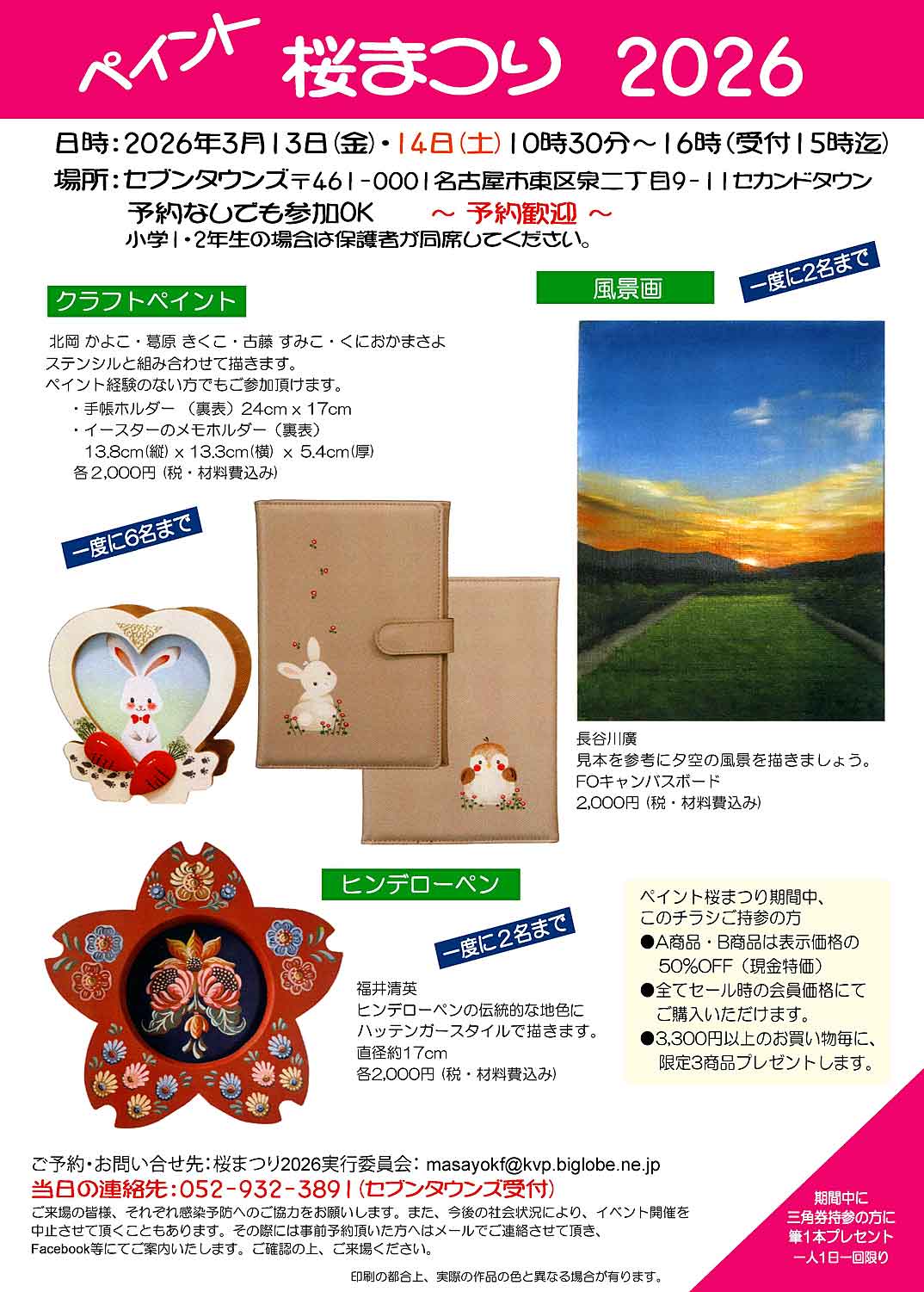 お問い合せ先:桜まつり2026実行委員会 当日の連絡先:052-932-3891(セブンタウンズ) 状況により、イベント開催を中止させて頂くこともあります。 その際には事前予約頂いた方へはメールでご連絡させて頂き、 Facebook等にてご案内いたします。ご確認の上、ご来場ください。 https://www.instagram.com/masayokunioka/ |