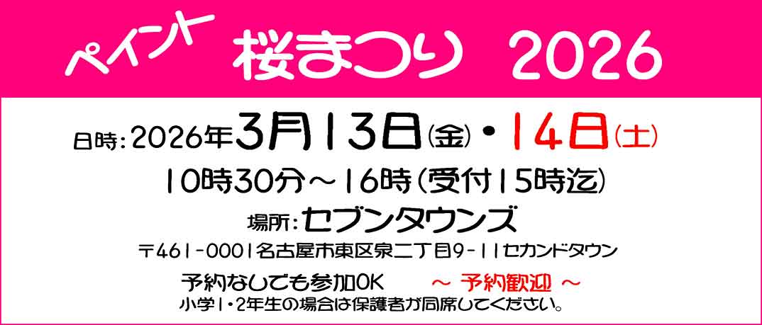 〜お知らせ〜 早咲きの桜、大寒桜オオカンザクラの並木道、3月上旬〜中旬見頃 「桜通泉二丁目」交差点から「芳野二」交差点北まで約140本の桜並木 この時期にショップ(セブンタウンズ)にてイベントを開催 桜情報は ![]() こちら 地下鉄桜通線【高岳駅】から当ショップまで桜並木 この時期は、かなり渋滞が予想されます。 お天気が良い日は、高岳駅から徒歩がおすすめ 11時〜13時がサクラの光道となり、とっても素敵ですよ。 また、ショップ近くにある秘密の三色椿も開花時期。場所はスタッフにお聞きください ペイント 桜まつり 2026 2026年 3月13日(金)・14日(土) 10時30分〜16時(受付15時迄) 場所:セブンタウンズ 〒461-0001名古屋市東区泉二丁目9-11セカンドタウン https://maps.app.goo.gl/HjvgH6KF36QpTrBx9 予約なしでも参加OK 〜 予約歓迎 〜 小学1・2年生の場合は保護者が同席してください。