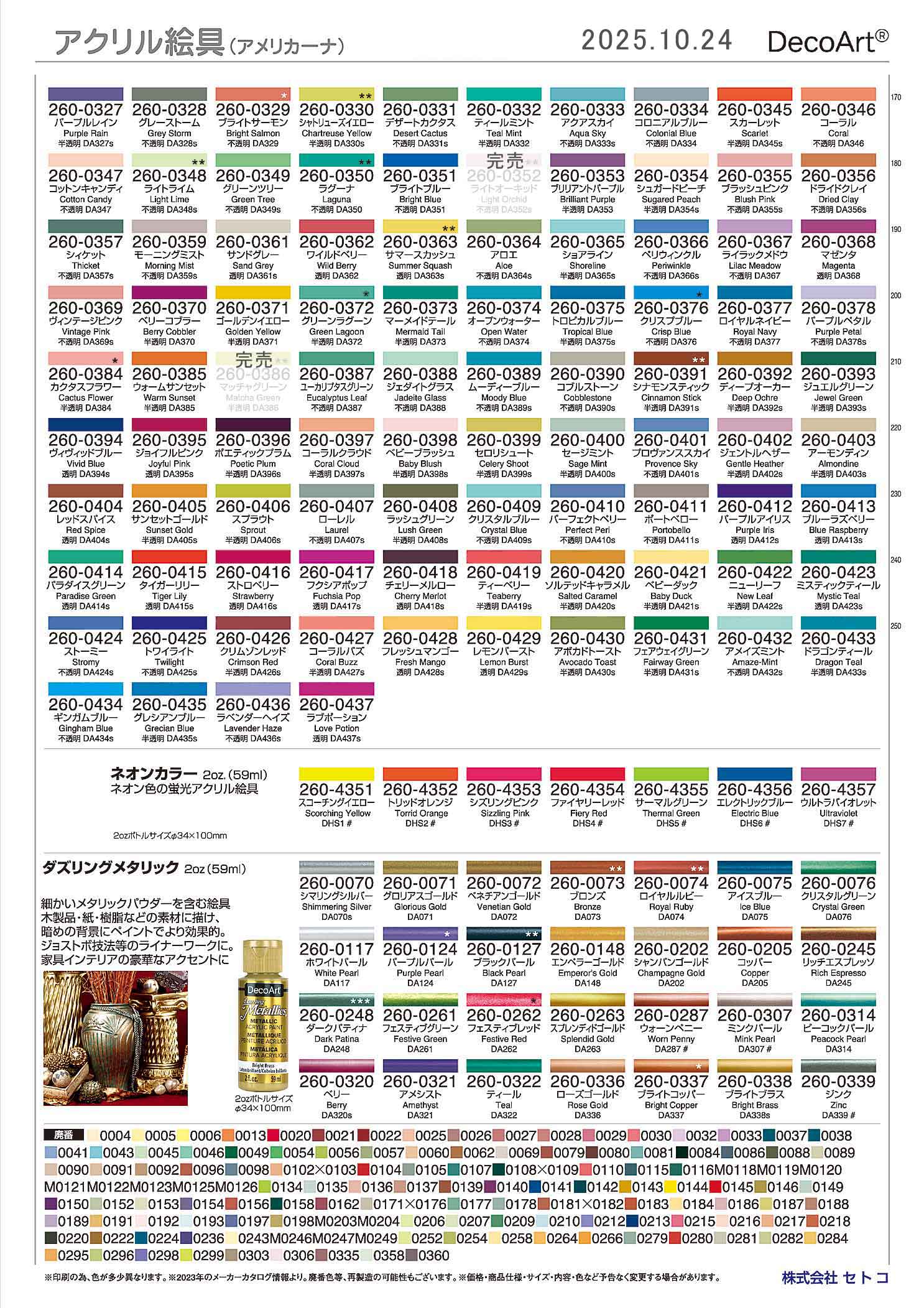 ![]() アクリル絵具-4 デコアート アメリカーナ絵具 水性アクリル絵具 使用可能な表面:木材、キャンバス、テラコッタ、紙、発泡スチロール、素焼きの陶器 屋外使用不可。 仕上がり:マット(ツヤなし) 粘度:中 指触乾燥時間:約20〜30分(気温、湿度などにより異なる) 完全硬化時間:約5〜7日(気温、湿度などにより異なる) 使用道具は石鹸と水でお手入れできます。 ![]() DA022・DA024・DA027・DA034・DA036・DA041 DA051・DA052・DA086 上記カラー番号は8oz(236ml)店頭限定にて特別価格 数量限定販売 デコアート社商品は値上げしております。 アメリカーナ・ノーマルカラー¥600★(税込¥660) アメリカーナ・エニッドカラー¥770★(税込¥847) ダズリングメタリックカラー¥660★(税込¥726) ※さらに、価格を変更する場合がございます。随時ページを更新していただき、ご確認ください。 ameri01_20251003.jpg ![]() デコアート社商品は値上げしております。 アメリカーナ・ノーマルカラー¥600★(税込¥660) アメリカーナ・エニッドカラー¥770★(税込¥847) ダズリングメタリックカラー¥660★(税込¥726) ※さらに、価格を変更する場合がございます。随時ページを更新していただき、ご確認ください。 ameri02_20251024.jpg
