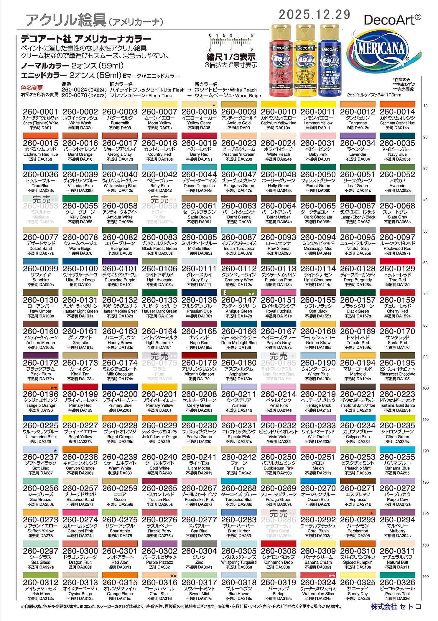 廃番になったアメリカーナのアクリル絵の具混ぜ合わせチャート https://cdn.shopify.com/s/files/1/0734/5933/5401/files/Americana-Acrylic-Retired-Colors-Mixing-Chart-20230303.pdf ジョー・ソニアとアメリカーナのアクリル絵の具への混ぜ合わせチャート https://cdn.shopify.com/s/files/1/0734/5933/5401/files/DecoArt_Color_Conversion_Chart_-_Jo_Sonjas_Artists_Colours_To_Americana.pdf フォークアートからアメリカーナのアクリル絵の具への混ぜ合わせチャート https://cdn.shopify.com/s/files/1/0734/5933/5401/files/DecoArt_Color_Conversion_Chart_-_Plaid_FolkArt_To_Americana.pdf デルタセラムコートからアメリカーナのアクリル絵の具への混ぜ合わせチャート https://cdn.shopify.com/s/files/1/0734/5933/5401/files/DecoArt_Color_Conversion_Chart_-_Delta_Ceramcoat_To_Americana.pdf ↓↓↓各絵具とアメリカーナとのカラーコンバージョン(色変換表)↓↓↓ ■セラムコート ■フォークアート ■トラディション ■ジョソーニャ 絵具-6 以下画像は2021年の情報 ![]() |
