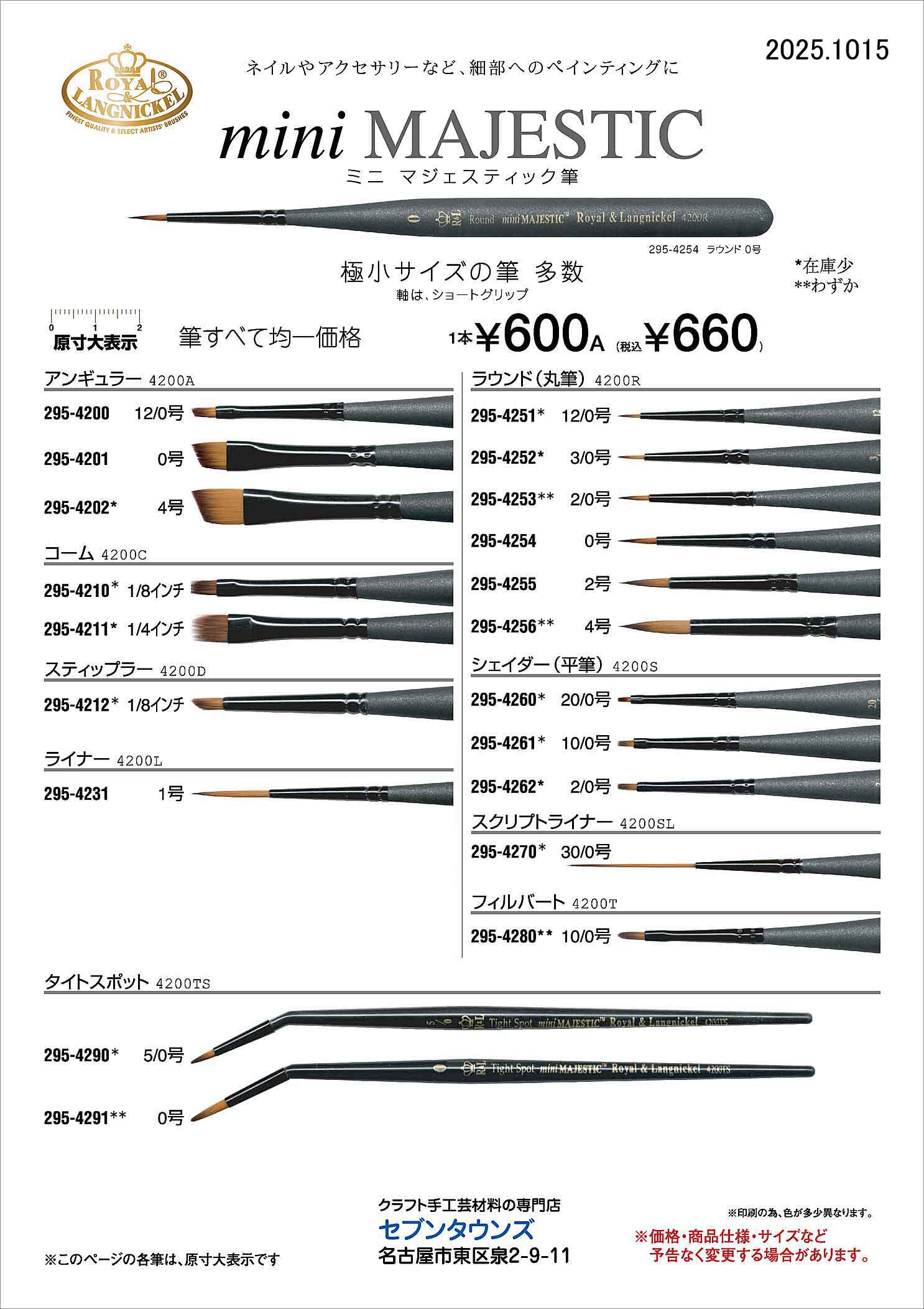細部へのペインティングに ミニマジェスティック筆 アンギュラー295-4200、295-4201、295-4202、 コーム295-4210、295-4211、 スティップラー295-4212、 ライナー295-4231、 ラウンド295-4251、295-4252、295-4253、295-4254、295-4255、295-4256、 シェイダー295-4260、295-4261、295-4262、 スクリプトライナー295-4270、 フィルバート295-4280、 タイトスポット295-4290、295-4291、