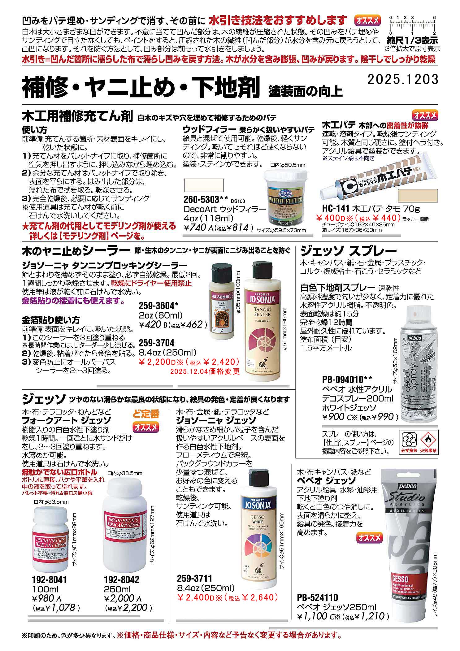 | 下塗り-1 ※スプレー商品は店頭のみの販売となります。ご了承ください。 ※さらに、価格を変更する場合がございます。随時ページを更新していただき、ご確認ください。 basecoat01_20251203.jpg ![]() ※スプレー商品は店頭のみの販売となります。ご了承ください 白木補修用充てん剤 ウッドフィラー、260-5303、DS103、 木工パテAタモ70g、HC-141、 木のヤニ止めシーラー ジューソニア タンニンブロッキングシーラー、259-3604、259-3704、 ペベオ水性アクリルホワイトジェッソスプレー下地剤 白色下地剤スプレー、PB-094010、 フォークアート ジェッソ 192-8041、192-8042、 ジョーソニア ジェッソ、259-3711、 ペベオ ジェッソ、PB-524110 |