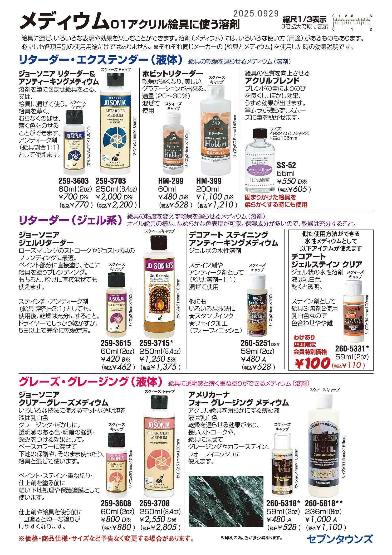 値上げ告知がございました。順次、価格変更いたします。 ※さらに、価格を変更する場合がございます。随時ページを更新していただき、ご確認ください。 ★メディウム01・アクリル絵具に使う溶剤、 ●リターダー・エクステンダー液体、 ジョーソニア リターダー&アンティーキングメディウム、60ml、259-3603、250ml、259-3703、 ホビットリターダー60ml、HM-299、ホビットリターダー200ml、HM-399、 、、アクリルブレンド、SS-52、 ●リターダージェル系、 ジョーソニア ジェルリターダー、60ml、259-3615、250ml、259-3715、 デコアート ステイニングアンティーキングメディウム、260-5251、 デコアート ジェルステイン クリア、260-5331、 ●グレーズ・グレージング液体、 ジョーソニア クリアーグレーズメディウム、60ml、259-3608、250ml、259-3708、 アメリカーナ フォーグレージングメディウム、260-5318、260-5818、 ![]() |
