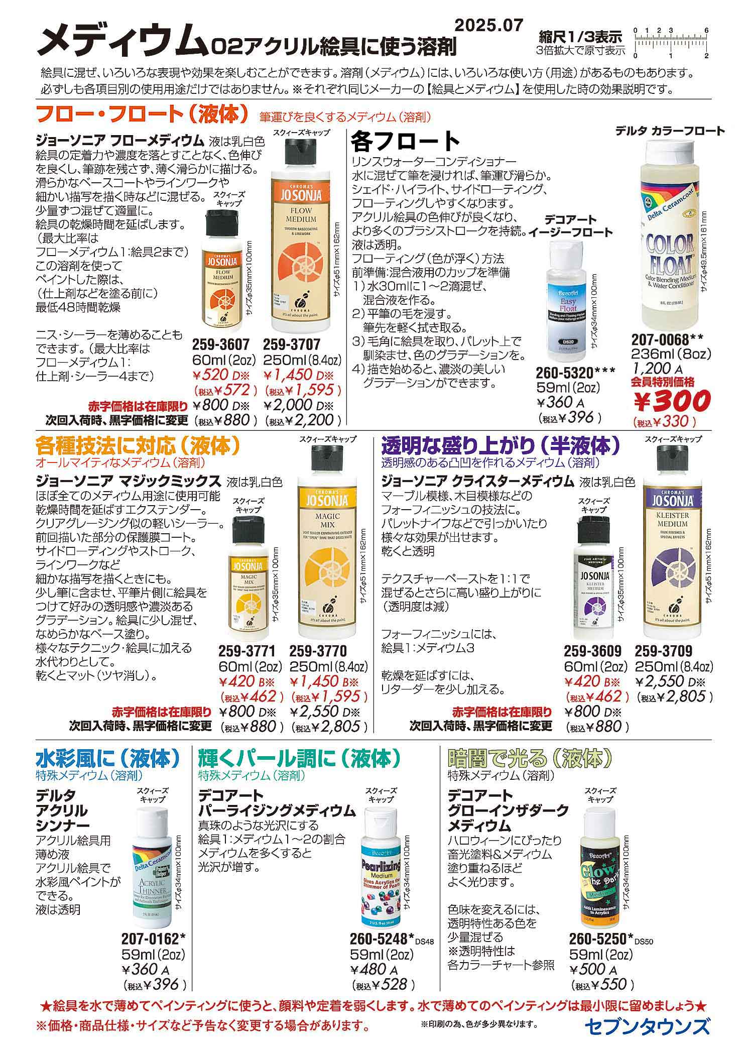 以下掲載商品、現時点での価格変更 ※さらに、価格を変更する場合がございます。随時ページを更新していただき、ご確認ください。 ★メディウム02・アクリル絵具に使う溶剤、 ●フロー・フロート液体 ジョーソニア フローメディウム、60ml、259-3607、250ml、259-3707、 デコアート イージーフロート、260-5320、 デルタ カラーフロート、207-0068、 ●各種技法に対応 ジョーソニア マジックミックス、60ml、259-3771、250ml、259-3770、 ●透明な盛り上がり ジョーソニア クライスターメディウム、60ml、259-3609、250ml、259-3709、 ●水彩風に デルタ アクリルシンナー、207-0162、 ●輝くパール調に デコアート パーライジングメディウム、260-5248、 ●暗闇で光る デコアート グローインザダークメディウム、260-5250、 ![]() |