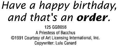 「Have a happy birthday, and that's an order.」 (誕生日おめでとう、これは命令だ) バッカスの巫女 アートライセンシングインターナショナル社提供 コピーライター:ルル・カナード