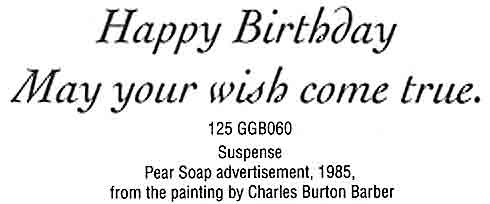 「Happy Birthday May your wish come true.」 ハッピーバースデー あなたの願いが叶いますように サスペンス 1985年のペアーソープの広告 原画の画家:チャールズ・バートン・バーバー