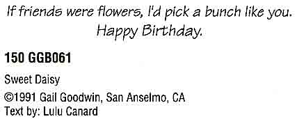 もし友人が花だったら、あなたのような花束を選ぶでしょう。 お誕生日おめでとう スウィートデイジー Gail Goodwin、サン・アンセルモ、カリフォルニア州 テキスト:Lulu Canard
