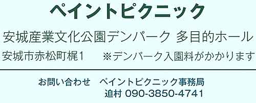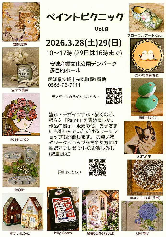 〜お知らせ〜![]() ![]() ペイントピクニックvol.8 2026年 3月28日(土)・29日(日) 10:00〜17:00 最終16:00 安城産業文化公園デンパーク 多目的ホール ※デンパークには入園料がかかります。 https://denpark.jp/ 〒446-0046 愛知県安城市赤松町梶1番地 https://maps.app.goo.gl/zmMH3c7ZURxMvHfq6 TEL:0566-92-7111 塗る・デザインする・描くなど、 様々な「Paint」を集めました。 作品の展示・販売の他、 お子さまでも楽しめるワークショップも開催します。 お買い物やワークショップをされた方には 抽選でプレゼントのお楽しみも!(数量限定) 鋤柄淑恵 フローラルアートKleur 佐々木富美 こやなぎみちこ ほぼーはりこ Rose Drop 杉江絵美 IVORY manamana(29日) すずいたかこ Jelly-Beans 瑠香(るか)(28日) 迫村寿子 お問い合わせ ペイントピクニック事務局 https://www.instagram.com/japantole_sako/ ↑詳細はこちら |