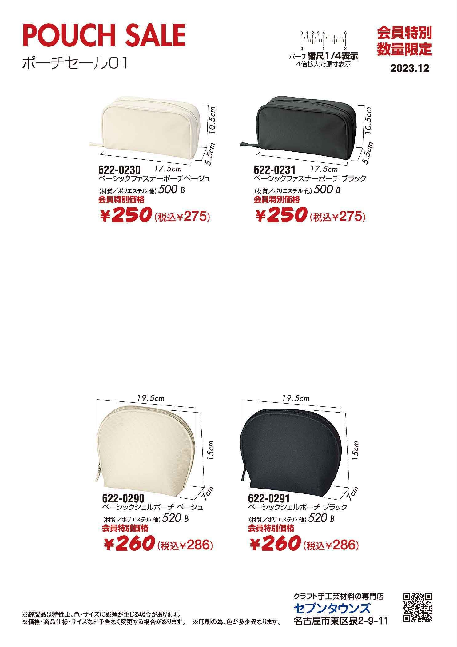 ベーシックファスナーポーチ、622-0230ベージュ、622-0231ブラック、