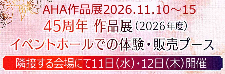 講師・生徒の皆様の親睦機関 American Handicrafts Association(R) アメリカン ハンディクラフト協会〈名古屋支部〉アメリカン ハンディクラフト学院教室内 アメリカンハンディクラフト協会では、作品展・研修会・会報の発行・ 作品の販売バザー・親睦会の開催e.t.c.の活動をしています。 講師また生徒対象、年会費を支払いますと協会の正会員になります。 正会員の皆様は作品展の出展・《研修会・親睦会・作品の販売バザー》への参加・ 会報の発行・お店での特別割引セール等の対象になり、いろいろなメリットがあります。