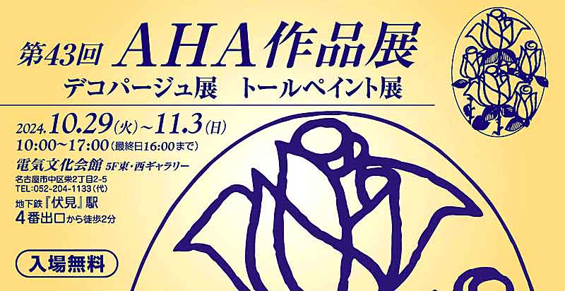 東海地区にて デコパージュ&トールペイント 最大級のクラフト作品展 第43回 AHA作品展 2024年 10月29日〔火〕〜11月3日〔日〕 10:00〜17:00 (最終日16:00まで) 会場:電気文化会館 5階 東・西ギャラリー