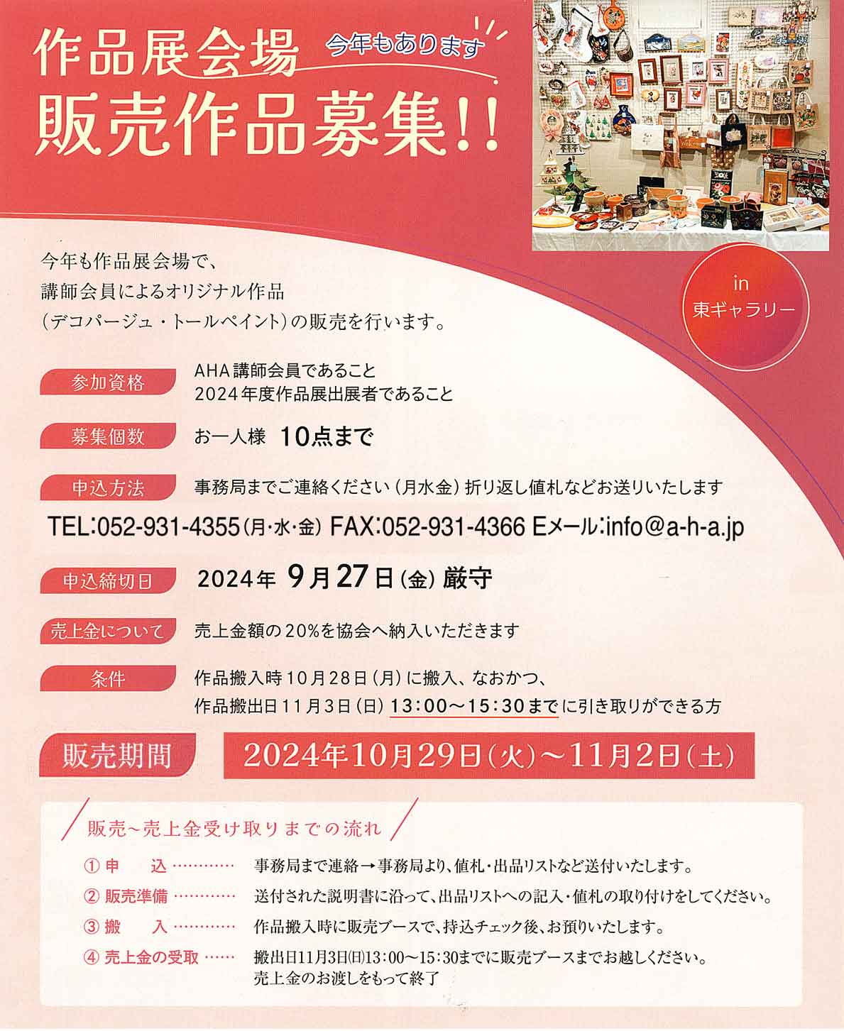 作品展会場であなたの作品を販売しませんか? 販売作品募集いています。 詳しくは、AHA事務局までお問い合わせください。 お問い合わせ先 アメリカンハンディクラフト協会 名古屋市東区泉2丁目9-11セカンドタウン2-B TEL:052-931-4355 http://a-h-a.jp E-mail:info@a-h-a.jp
