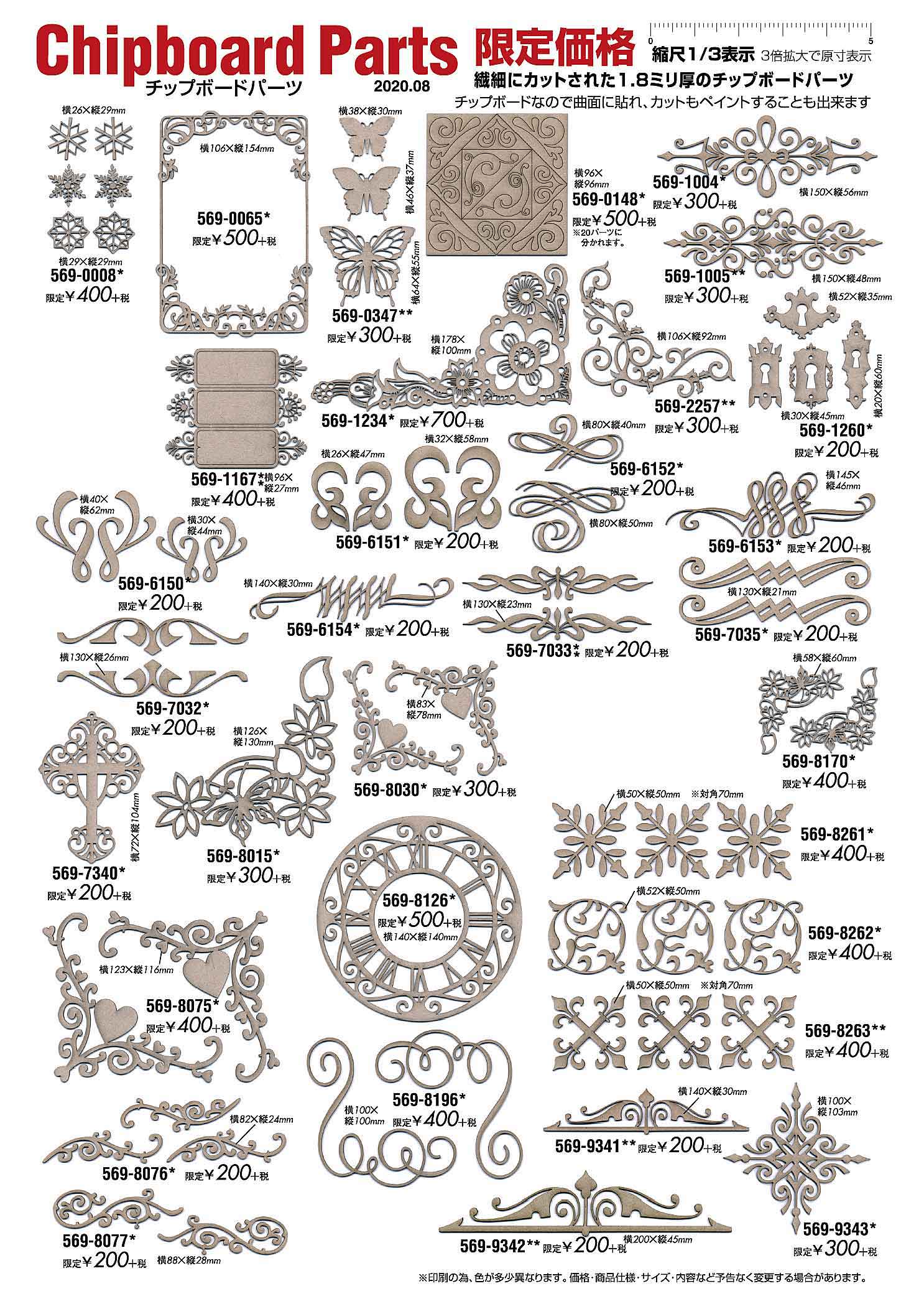 チップボードパーツを使用した作品 クラフトアイデア031装飾関連-10チップボードパーツ 1.8ミリの厚紙ボードをレーザカットにて いろいろな形のパーツになっています。 569-0008、569-0065、569-0347、569-0148、569-1004、569-1005、 569-1167、569-1234、569-2257、569-1260、 569-6150、569-6151、569-6152、569-6153、569-6154、 569-7032、569-7033、569-7035、569-7340、569-8015、569-8030、 569-8075、569-8076、569-8077、569-8126、569-8170、569-8196、 569-8261、569-8262、569-8253、569-9341、569-9342、569-9343、 品番後ろの*マークは *在庫少ない **残りわずか ![]() |