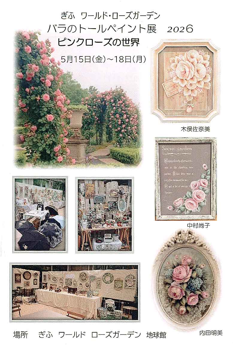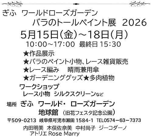 ぎふ ワールドローズガーデン バラのトールペイント展 2026 2026年 5月15日(金)〜18日(月) 10:00〜17:00 最終15:30 ぎふ ワールド・ロースガーデン (旧花フェスタ記念公園) 花の地球館(タワー近く)にて開催 https://gifu-wrg.jp/ 〒509-0213 岐阜県可児市瀬田1584-1 https://maps.app.goo.gl/oG4h7uoumWrGfpFu5 TEL:0574-63-7373 ★作品展示 ★バラのペイント小物、レース雑貨販売 ★レース編み 晴雨兼用傘 ★ガーデニンググッズ ★多肉植物 ワークショップ レース小物 シルクスクリーンなど 内田明美 木俣佐奈美 中村尚子 ジーコダーノ アトリエRose Marry |