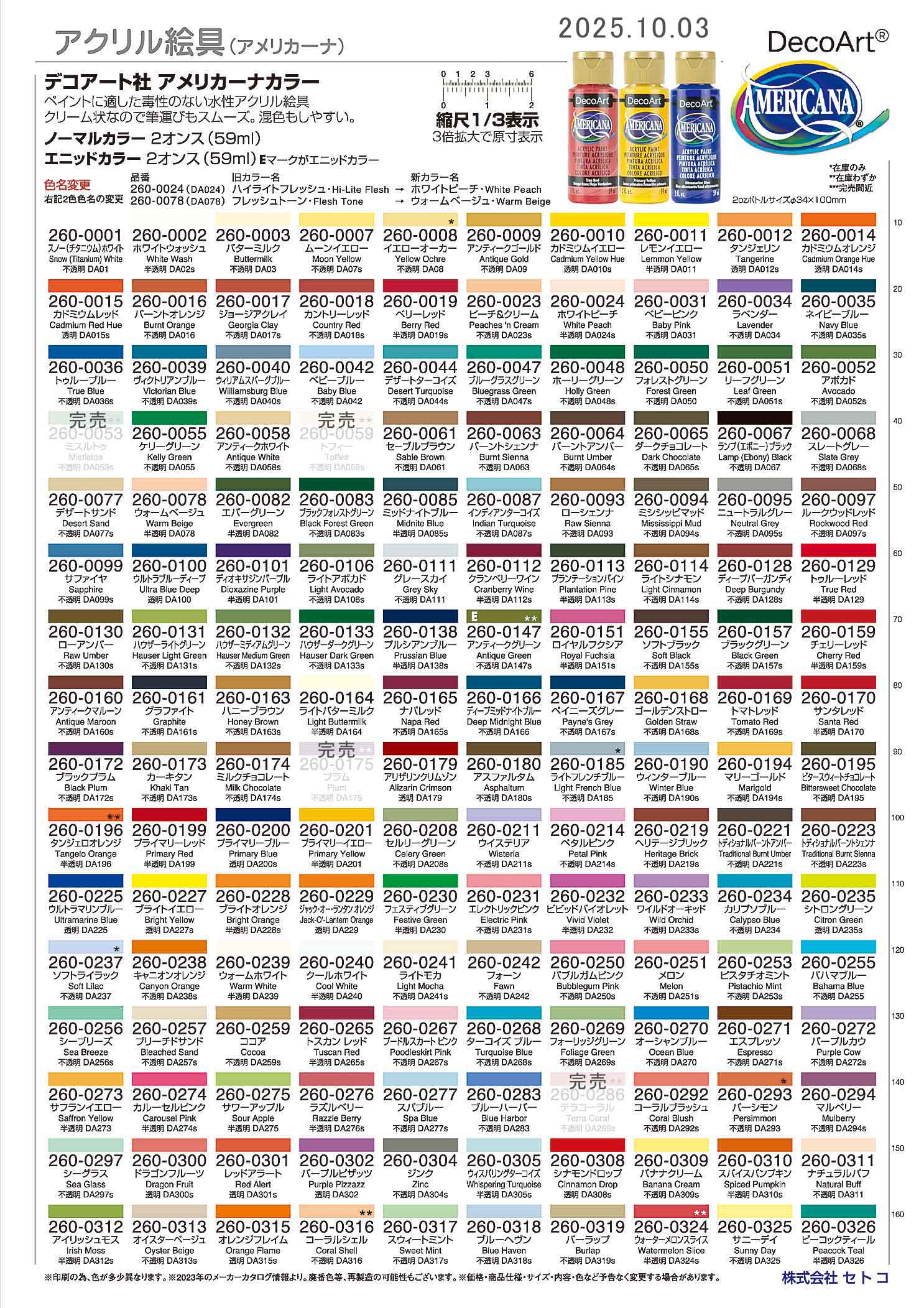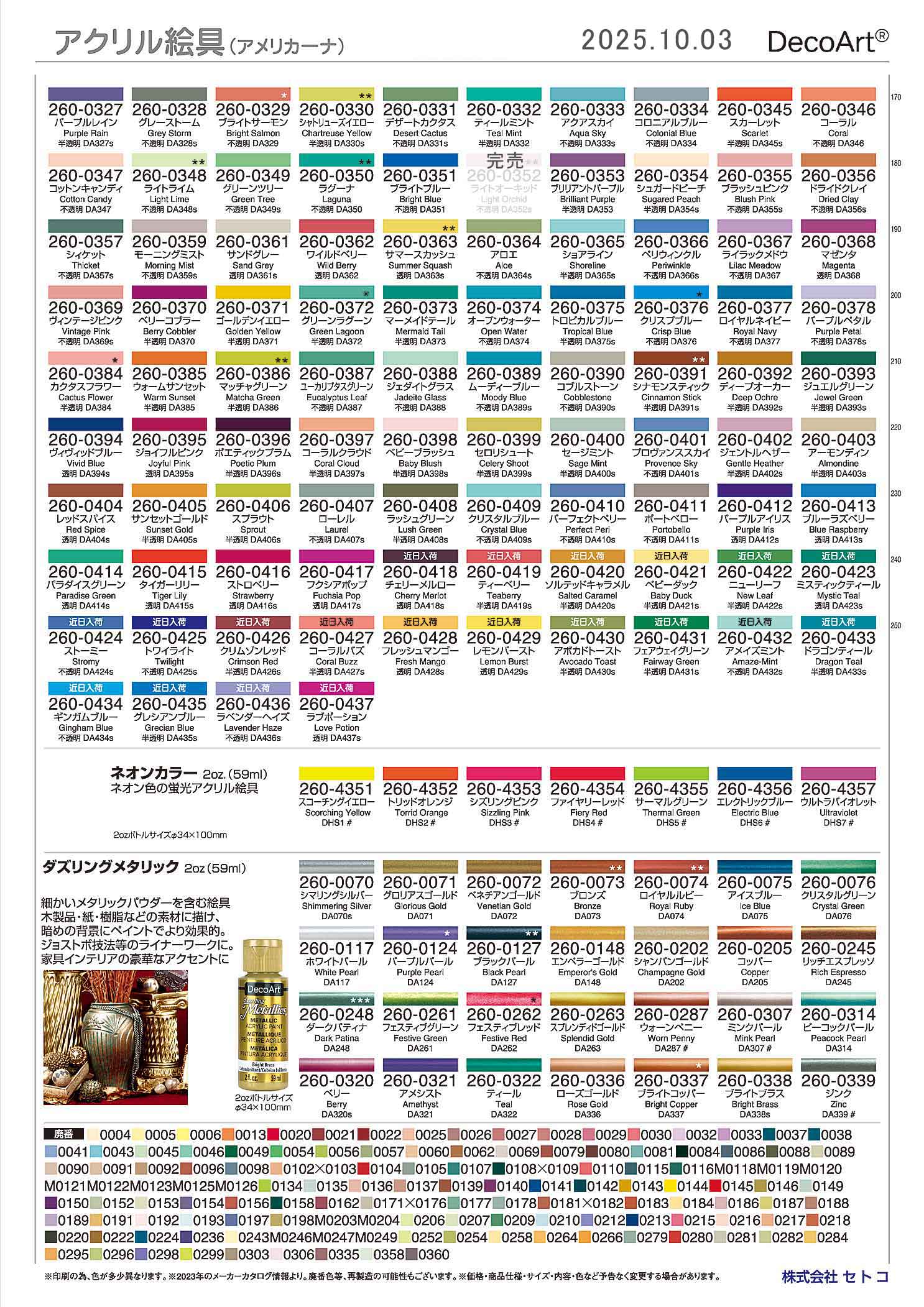 ![]() アクリル絵具-4 デコアート アメリカーナ絵具 水性アクリル絵具 使用可能な表面:木材、キャンバス、テラコッタ、紙、発泡スチロール、素焼きの陶器 屋外使用不可。 仕上がり:マット(ツヤなし) 粘度:中 指触乾燥時間:約20〜30分(気温、湿度などにより異なる) 完全硬化時間:約5〜7日(気温、湿度などにより異なる) 使用道具は石鹸と水でお手入れできます。 ![]() DA022・DA024・DA027・DA034・DA036・DA041 DA051・DA052・DA086 上記カラー番号は8oz(236ml)店頭限定にて特別価格 数量限定販売 デコアート社商品は値上げしております。 アメリカーナ・ノーマルカラー¥600★(税込¥660) アメリカーナ・エニッドカラー¥770★(税込¥847) ダズリングメタリックカラー¥660★(税込¥726) ※さらに、価格を変更する場合がございます。随時ページを更新していただき、ご確認ください。 ameri01_20251003.jpg ![]() デコアート社商品は値上げしております。 アメリカーナ・ノーマルカラー¥600★(税込¥660) アメリカーナ・エニッドカラー¥770★(税込¥847) ダズリングメタリックカラー¥660★(税込¥726) ※さらに、価格を変更する場合がございます。随時ページを更新していただき、ご確認ください。 ameri02_20251003.jpg ![]() 廃番になったアメリカーナのアクリル絵の具混ぜ合わせチャート https://cdn.shopify.com/s/files/1/0734/5933/5401/files/Americana-Acrylic-Retired-Colors-Mixing-Chart-20230303.pdf ジョー・ソニアとアメリカーナのアクリル絵の具への混ぜ合わせチャート https://cdn.shopify.com/s/files/1/0734/5933/5401/files/DecoArt_Color_Conversion_Chart_-_Jo_Sonjas_Artists_Colours_To_Americana.pdf フォークアートからアメリカーナのアクリル絵の具への混ぜ合わせチャート https://cdn.shopify.com/s/files/1/0734/5933/5401/files/DecoArt_Color_Conversion_Chart_-_Plaid_FolkArt_To_Americana.pdf デルタセラムコートからアメリカーナのアクリル絵の具への混ぜ合わせチャート https://cdn.shopify.com/s/files/1/0734/5933/5401/files/DecoArt_Color_Conversion_Chart_-_Delta_Ceramcoat_To_Americana.pdf ↓↓↓各絵具とアメリカーナとのカラーコンバージョン(色変換表)↓↓↓ ■セラムコート ■フォークアート ■トラディション ■ジョソーニャ 絵具-6 以下画像は2021年の情報 ![]() |