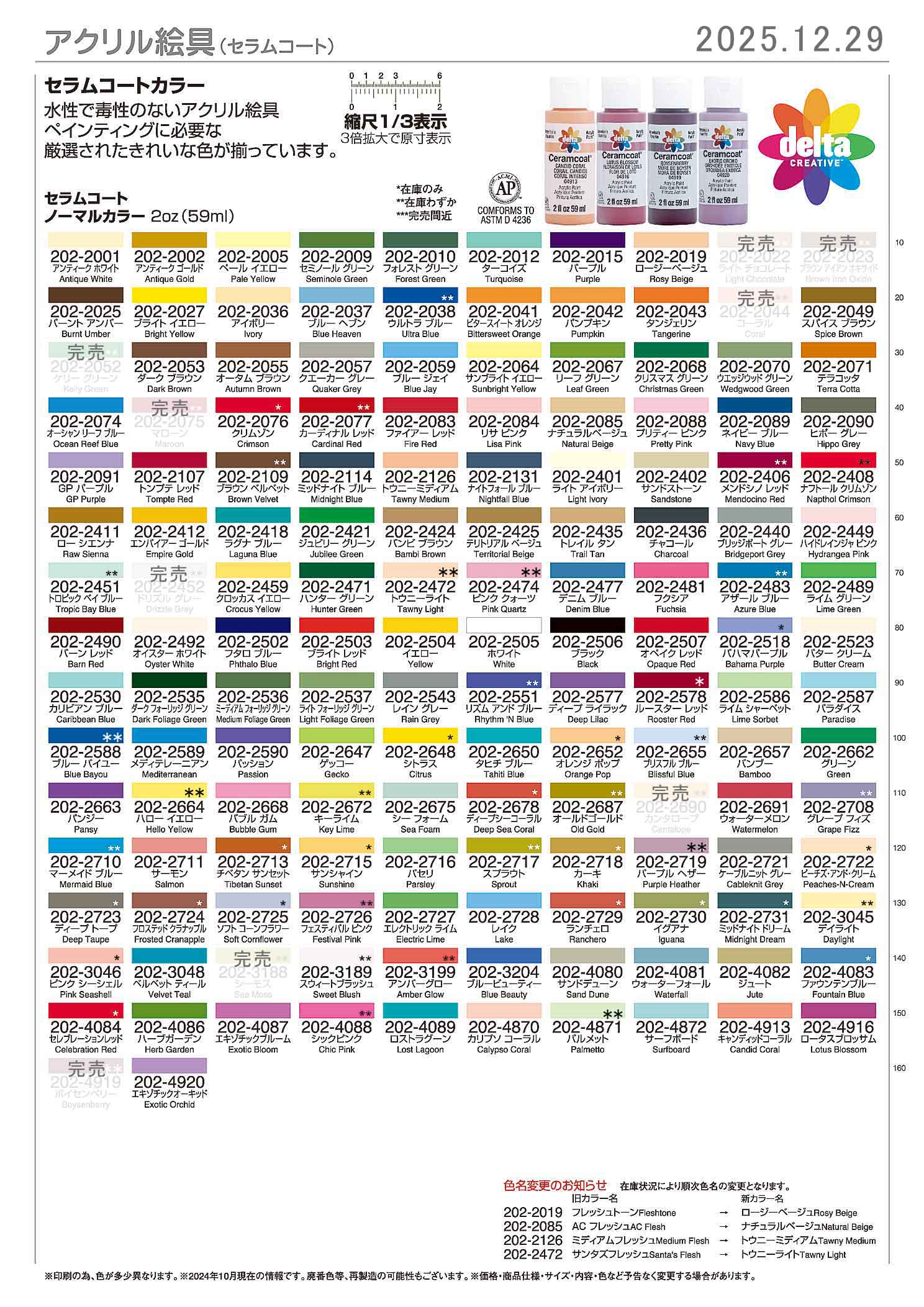 | 絵具-1 商品値上げ告知がございます。順次価格変更いたします。 セラムコートノーマルカラー¥600★(税込¥660) ※さらに、価格を変更する場合がございます。随時ページを更新していただき、ご確認ください。 セラムコート絵具 水性で毒性のないアクリル絵具 使用可能な表面:木材、キャンバス、テラコッタ、紙、素焼きの陶器 屋外には使用できません。 仕上がり:マット(ツヤなし) 粘度:やや低〜中 指触乾燥時間:約20〜30分(気温、湿度などにより異なる) 完全硬化時間:約5〜7日(気温、湿度などにより異なる) 使用道具は石鹸と水でお手入れできます。 アニメ塗りに「セラムコート(Ceramcoat)」を使用することは、 乾くと落ち着いた艶消しになりマットな質感から、 フィギュアのリペイントやプラモデルの筆塗りに向いています。 セラムコートは水で薄めず、そのまま塗れます。 ※プラスチックに直接塗ると剥がれやすいため、 必ずサーフェイサー(下地材)を吹いてから使用してください。 ce_01_20251229.jpg ![]() 商品値上げ告知がございます。順次価格変更いたします。 セラムコートメタリック・パールカラー¥660★(税込¥726) ※さらに、価格を変更する場合がございます。随時ページを更新していただき、ご確認ください。 セラムコート メタリックカラー セラムコート パールカラー ce_02_20251016.jpg