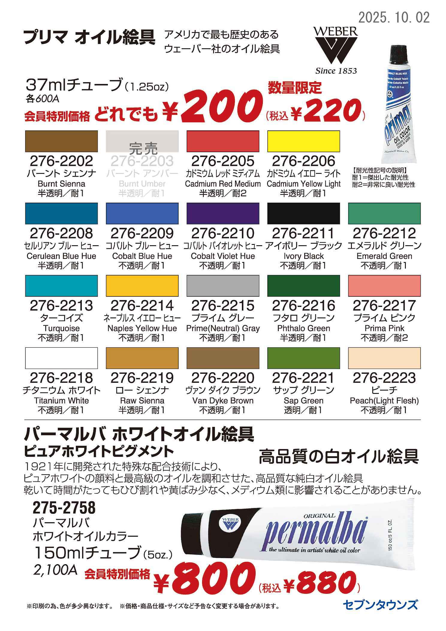 プリマ オイル絵具 276-2202、、276-2205、276-2206、 276-2208、276-2209、276-2210、276-2211、276-2212、 276-2213、276-2214、276-2215、276-2216、276-2217、 276-2218、276-2219、276-2220、276-2221、276-2223、