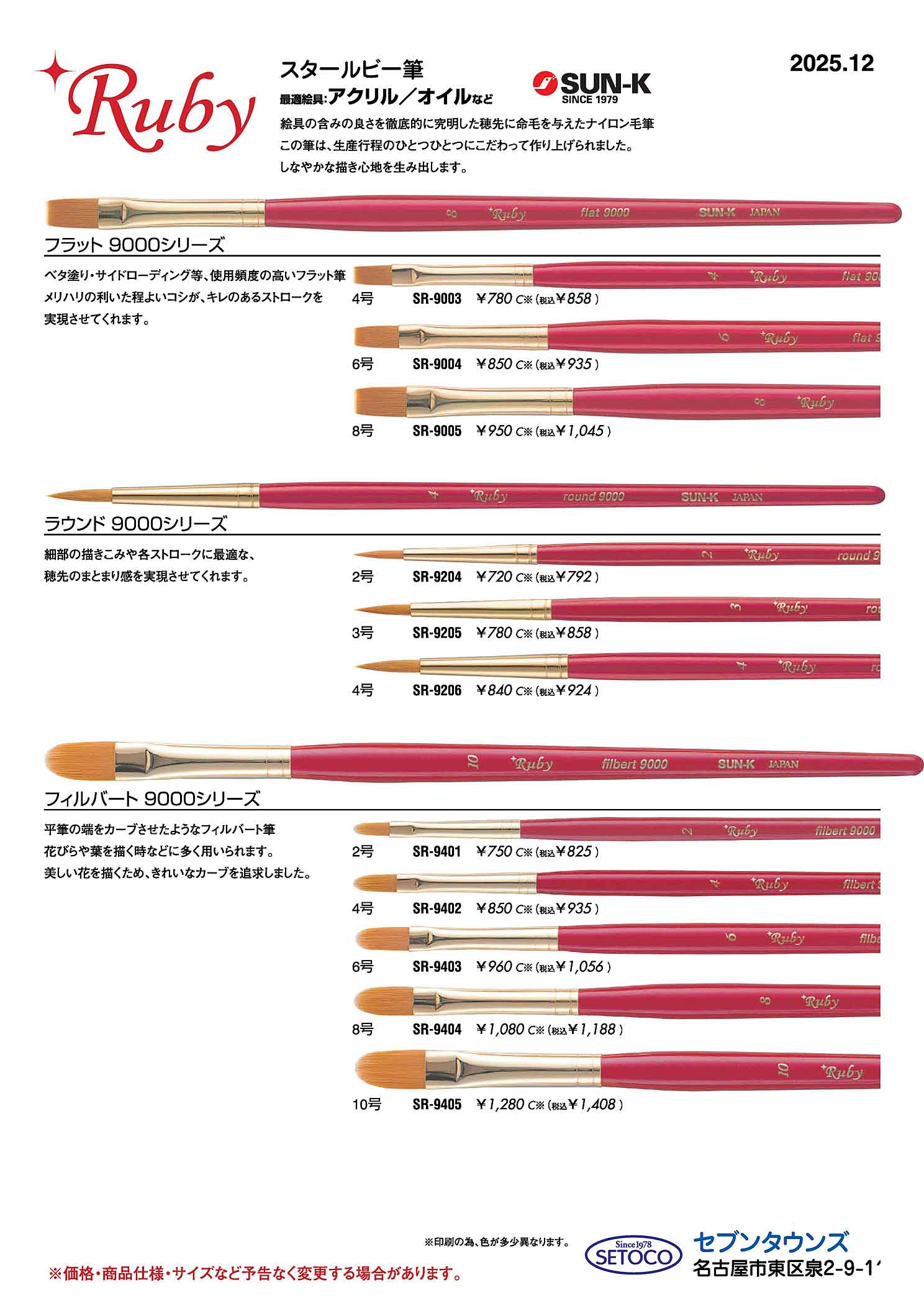 筆 ※予告なく、価格を変更する場合がございます。随時、ページを更新していただき、ご確認ください。 スタールビー筆 フラット9000シリーズ SR-9003、SR-9004、SR-9005、 ラウンド9000シリーズ SR-9204、SR-9205、SR-9206、 フィルバート9000シリーズ SR-9401、SR-9402、SR-9403、SR-9404、SR-9405、 brush_s_ruby01_202512.jpg ![]() |