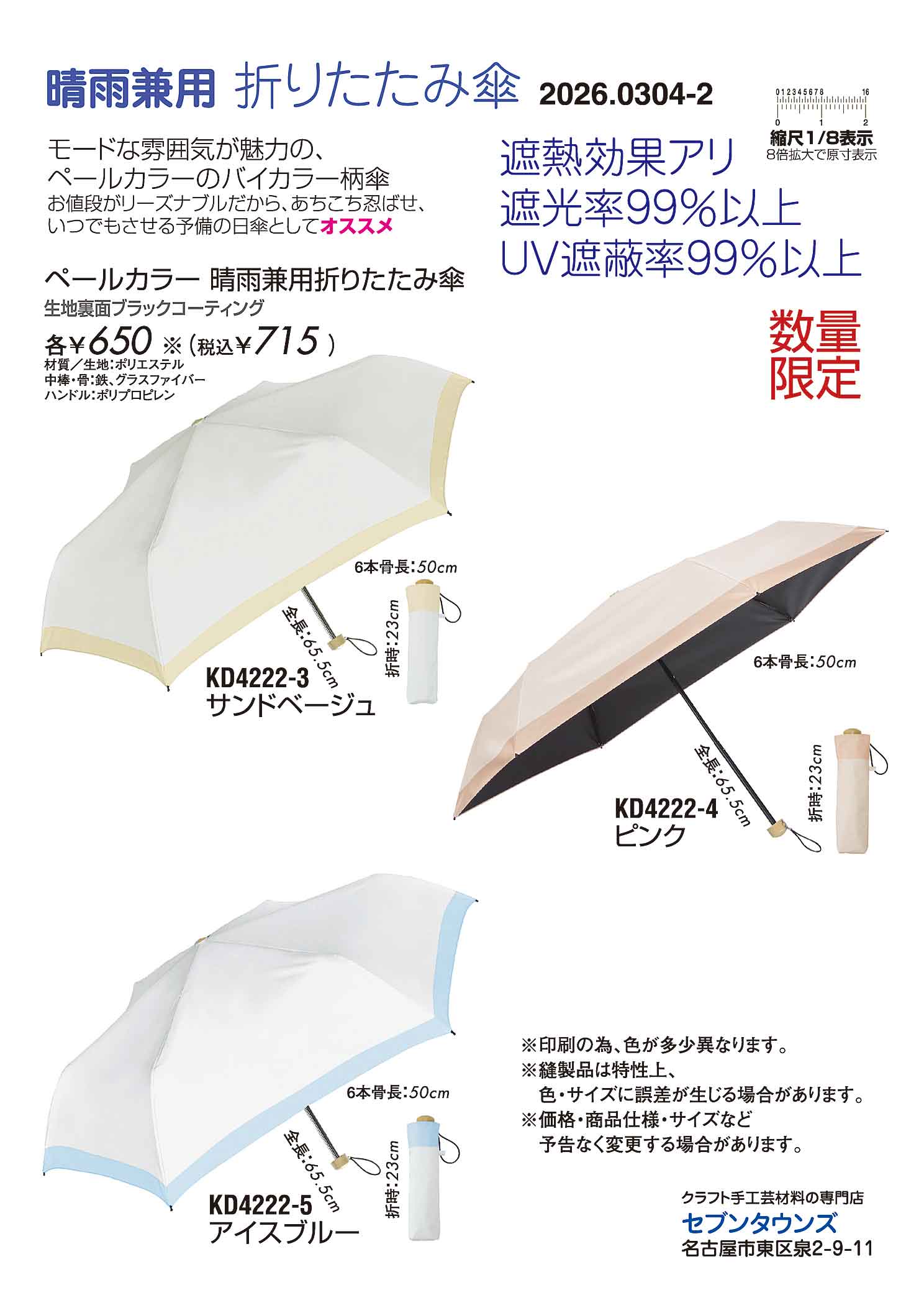 ペールカラー晴雨兼用折りたたみ傘KD4222-3、KD4222-4、KD4222-5、