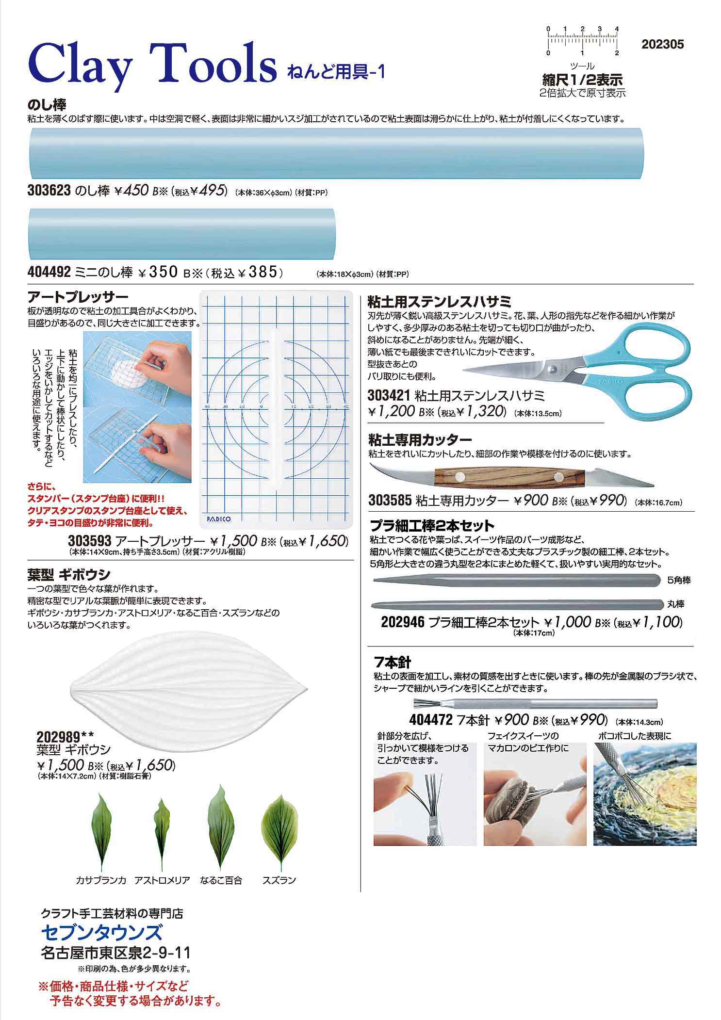 商品が値上がりしております。順次価格変更いたします。 ※予告なく、価格を変更する場合がございます。随時、ページを更新していただき、ご確認ください。 ねんど-5 のし棒、303623、404492、 アートプレッサー、303593、葉型、202989、 粘土用ステンシルハサミ、303421、 粘土専用カッター、303585、 プラ細工棒2本セット、202946、 7本針、404472、